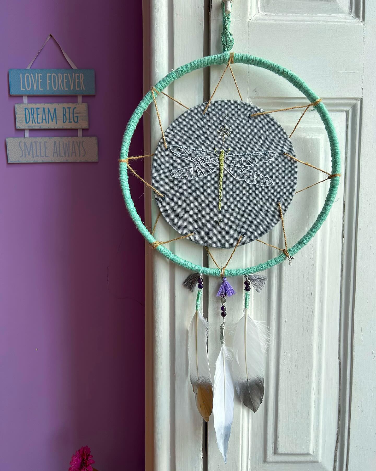 O arquétipo da Libelinha traz-nos um universo simbólico da transformação e adaptabilidade, da auto-realização e descoberta da verdade e a alegria e a leveza de ser. Invocada em meditações como um guia para a autoconsciência e a transformação interior, a beleza e leveza deste ser alado inspira-nos a transcender os nossos limites e a conectar-nos com a essência mais pura da nossa existência. No lado sombra (casulo) trabalha a necessidade de explorar aspetos escondidos da nossa personalidade para, depois de trazidos à consciência, serem ressignificados e vivermos o nosso lado luz, a nossa missão, com leveza, vendo para além das ilusões, com perícia, analisando as questões com uma nova perspetiva e adaptabilidade. O amuleto caça sonhos têm a somatização de vários elementos para auxiliarem o processo. A ilustração bordada manualmente, pedras naturais como a fushita que ajuda na revitalização da energia e tensões emocionais, estimulando o chakra do coração; a jaspe sangue de dragão que nos incentiva ao perdão e liberta-nos de medos e inseguranças, estimulando o chakra raíz e a ametista ligada à proteção, vitalidade e elevação espiritual. A geometria sagrada do octagrama circundado por um circulo representando o símbolo da esperança.