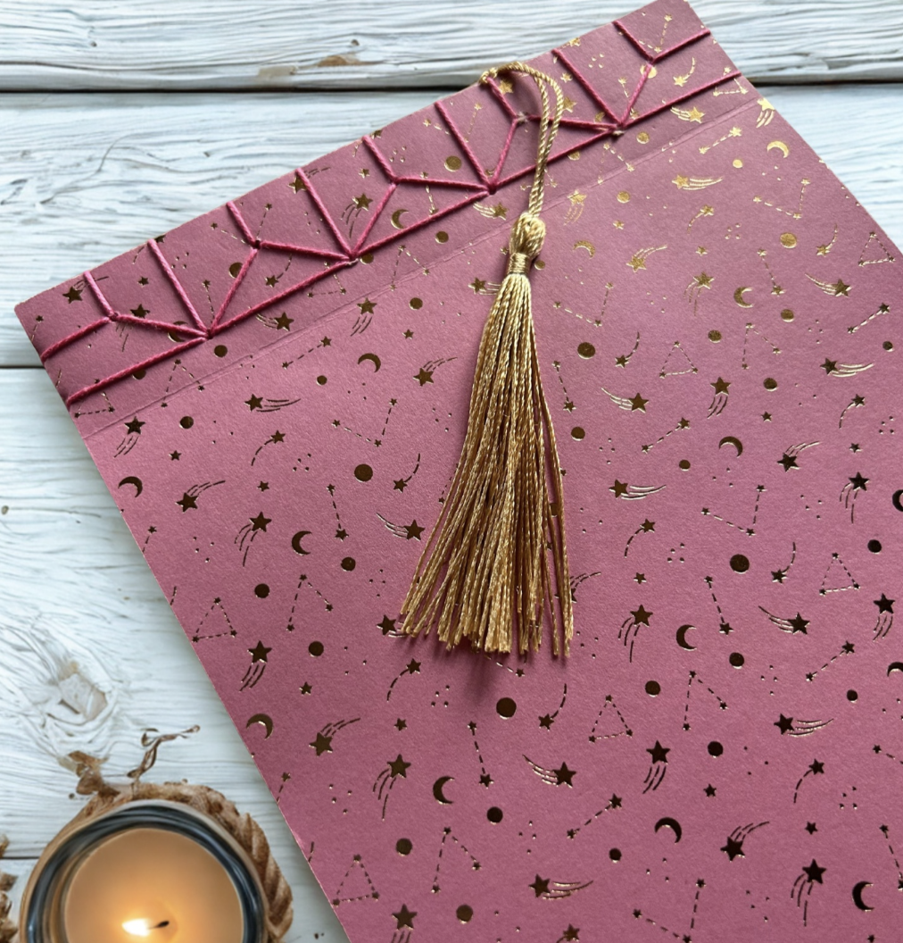 Caderno rosa com padrão dourado de constelações e tassel dourado